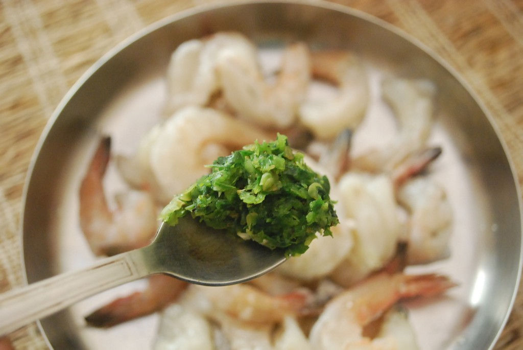 Add garlic, chilies, coriander and pepper into the mortar and make a paste until coarsely ground. Marinate the prawns with this mixture and refrigerate for an hour.