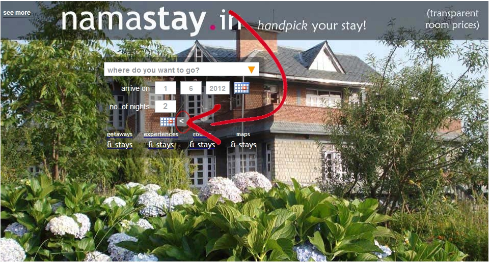 1. On the homepage I choose the destination of my choice and the dates and now I’m hunting for the ‘Go’ or ‘Search’ button. I hit the enter key in my keyboard, nothing happens. At last I figured out that the ‘>’ is the search button.