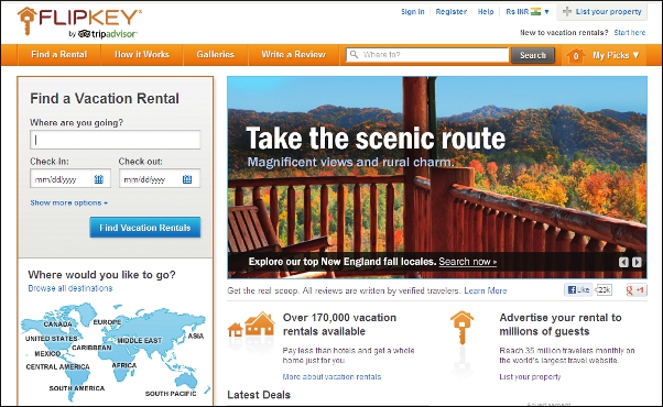 Flipkey.com is majority-owned by TripAdvisor and focuses on the vacation rental. While the website is like any other vacation rental website that allows owners to list their property and travelers to search for an appropriate accommodation, the fact that listing one’s property with Flipkey gives the added advantage to owners whose property is also featured on TripAdvisor.