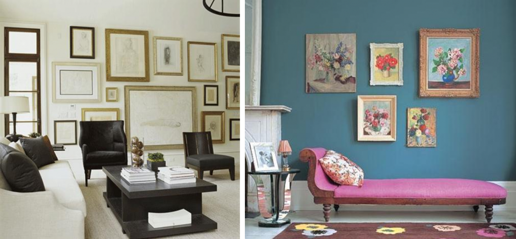 If you have furniture that you’re proud of, don’t let art in the room distract attention from them. Instead, highlight your collection by using a simple print or a home-made stencil artwork using the accent colour of your interiors, and frame it appropriately, making the whole space – painting, furniture, wall – look like a large art installation.