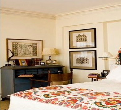 When there are more than one pictures in a room, align them with each other. For example, a dominant or primary picture can create the centre line for two smaller pictures, as in the photograph below, even though the second picture goes below the top line of the chest of drawers.