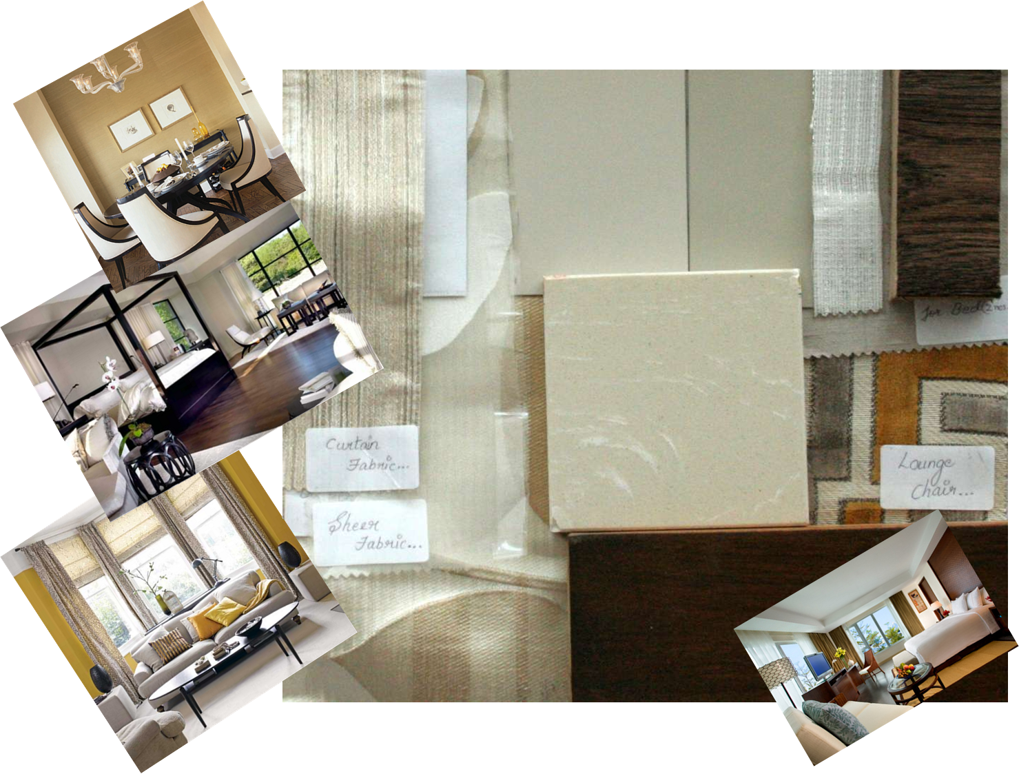 Moodboards are collections of samples of all materials you plan to use in your interiors. The samples are small in size, and usually proportionate to their intended use, so that, at a glance, you get an idea of all the colors and textures in a space.