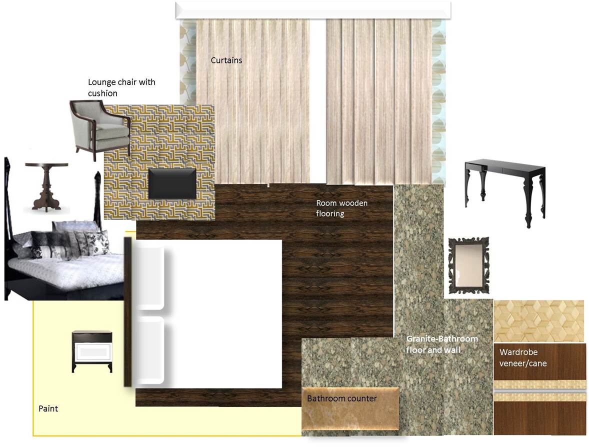 On the other hand, if you’re putting a moodboard together to present your ideas to someone – a client, an investor, perhaps – you can make the moodboard itself a presentation. Here is a moodboard that I put together for a hotel guestroom, and the guestroom picture is alongside. Notice that the frame of the moodboard matches the room cornice, and the white mount represents the white paint.